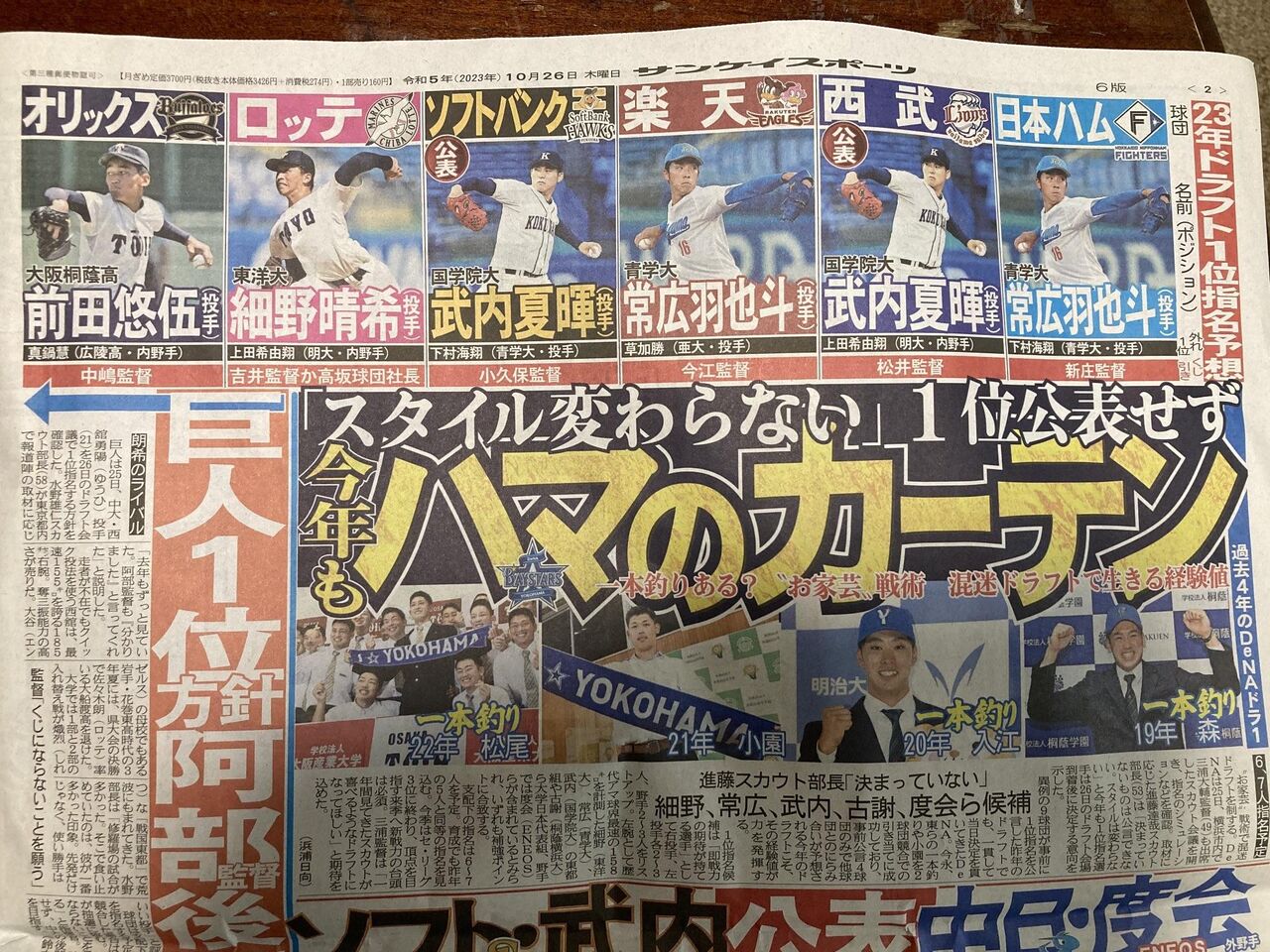 DeNAは東洋大・細野の1位指名が濃厚だ。進藤達哉スカウト部長は公表を控えたが「来年、力になってくれる選手」と即戦力の獲得を明言した。