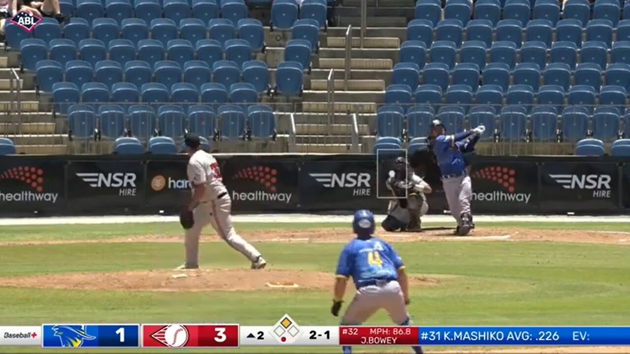 Kyosuke Mashiko launches his first ABL homer — a no-doubter over centre — to level it up at 3–3!